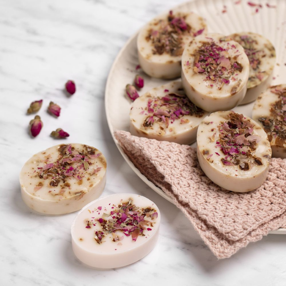 Creëer je eigen verzorgende sheazeep met een warme, herfstachtige geur van vanille en een romantische touch van gedroogde rozenblaadjes. 🌹 🧼